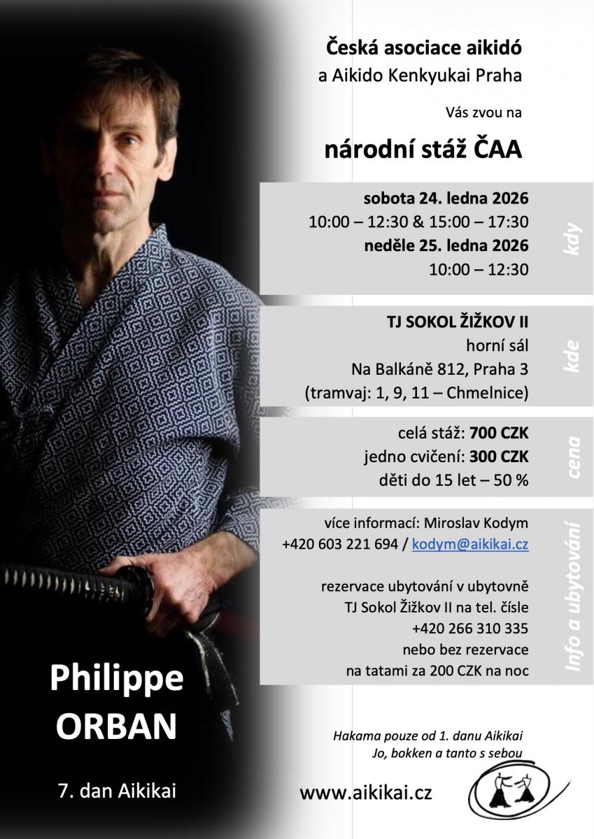O víkendu ve dnech 24.1. a 25.1.2026 proběhne v Praze na Balkáně stáž, kterou povede pan Philippe Orbán, 7. dan. Jedná se o pátou stáž tohoto učitele u nás. Všechny předchozí byly fakt pecka, tak doražte v hojném počtu.