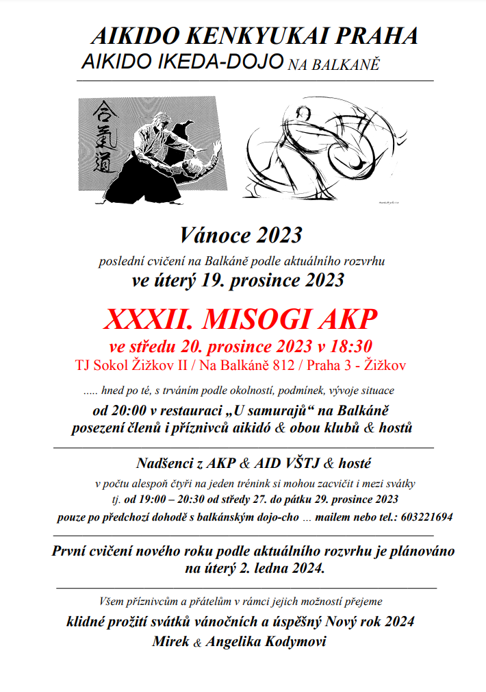 Srdečně vás zveme na aikidistické novoroční setkání v sobotu 6.1.2024 v našem dojo na ZŠ Tupolevova. Od 14:00 do 16:00 proběhne trénink, od 16:00 do 18:00 bude volná zábava. Vezměte s sebou ženy, muže, děti, cukroví. Pohovoříme, popijeme, cukroví sníme, děti vypustíme, hlavy vyčistíme. Vstupné 100 Kč, abychom pokryli nájem.